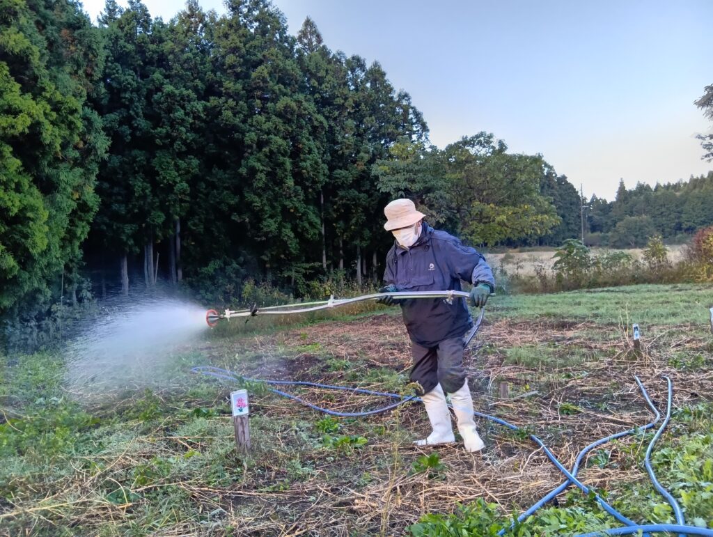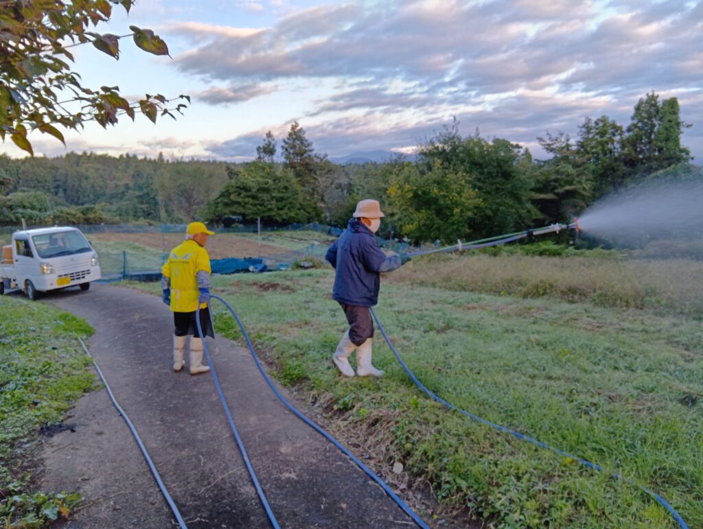 さて、一迫ゆり園は3日ほど前にイノシシ被害に逢いまして、本日午前6時から忌避剤散布作業を行いました。