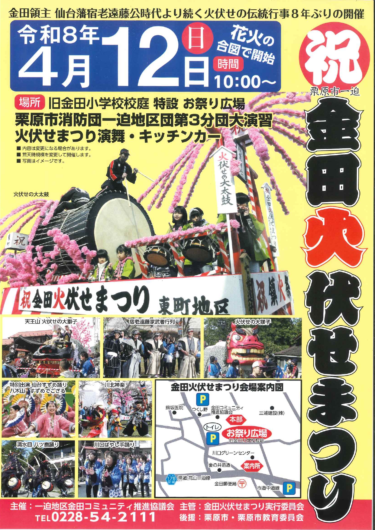 午前10時30分から お祭り広場(旧金田小学校校庭)での山車や清水目八ツ鹿踊り、川北神楽の郷土芸能などの披露